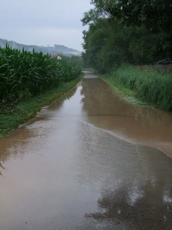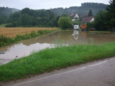 Im Ort hatte der Rohrbach alles auf ca. 80 cm Höhe unter Wasser gesetzt, Zäune mit mitgeführtem Morast und Geschwemme umgedrückt und Keller geflutet