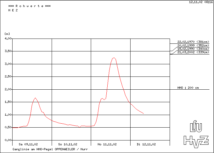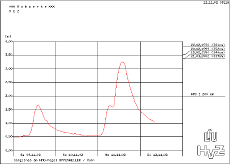 Das Hochwasser vom 11.11.2002 mit einem Höchststand von 325 cm als Ganglinie und als Einzelwerte
